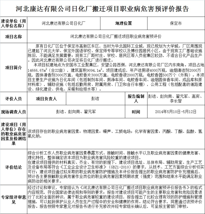 河北康达有限公司日化厂搬迁项目职业病危害预评价